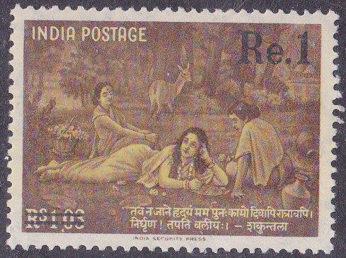 Auf einer Marke aus Indien (MiNr 314) sehen wir "Schakuntala" mit ihren Gespielinnen auf einer Waldlichtung beim Briefschreiben und eine Gazelle im Hintergrund, eine Szene aus dem Epos "Schakuntala" von Kalidasa (indischer Dichter, der wahrscheinlich Ende 4./Anfang 5. Jahrhundert zur Zeit des Guptareichs lebte) nach einem Gemälde von Raja Ravi Varma.
