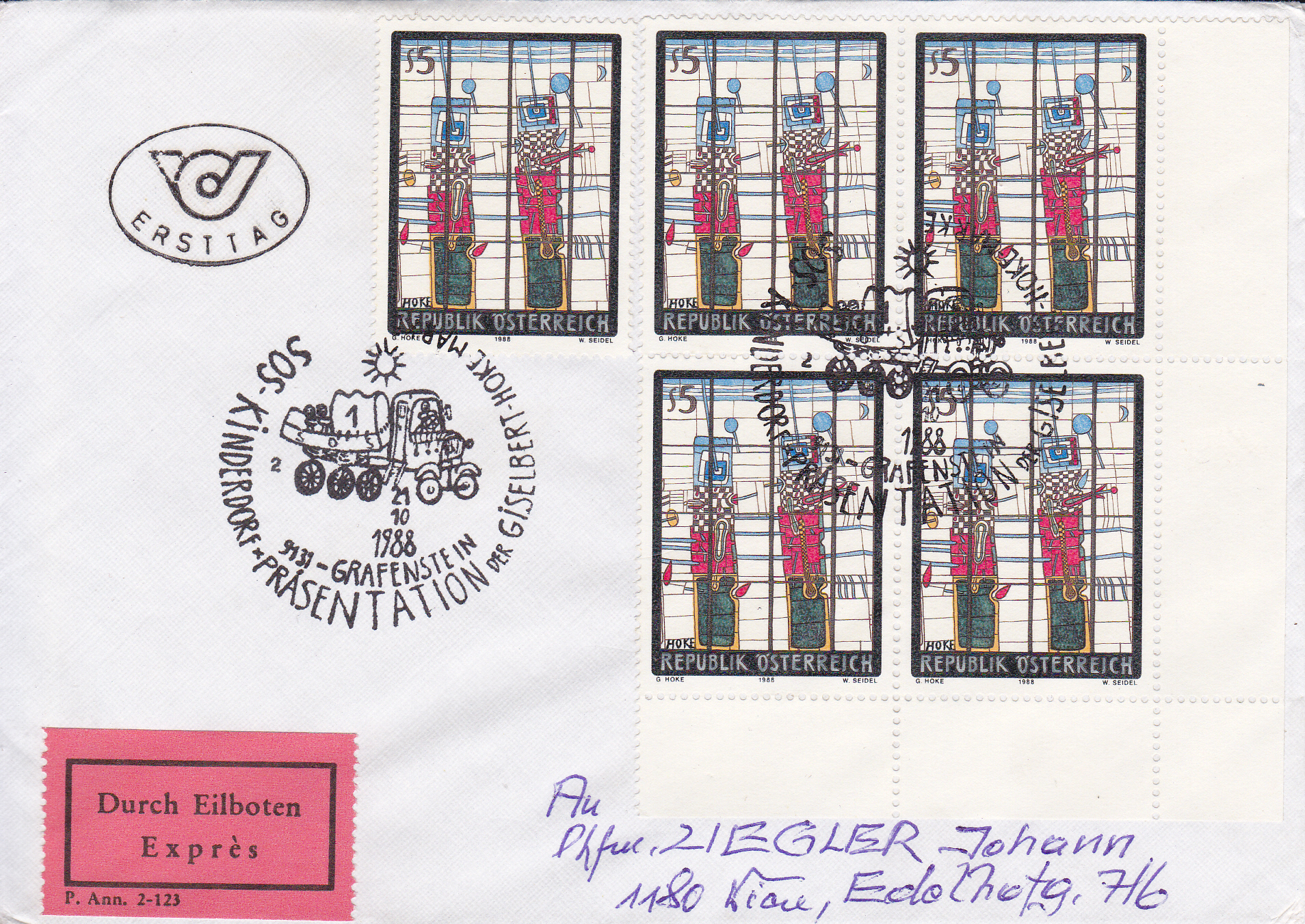 Brief per Eilboten vom Ersttag dieser Marke aus Österreich (MiNr 1938) mit dem Gemälde "Wächter" und dem Sonderstempel mit der Kennziffer "2" aus Grafenstein zur Präsentation der Marke.