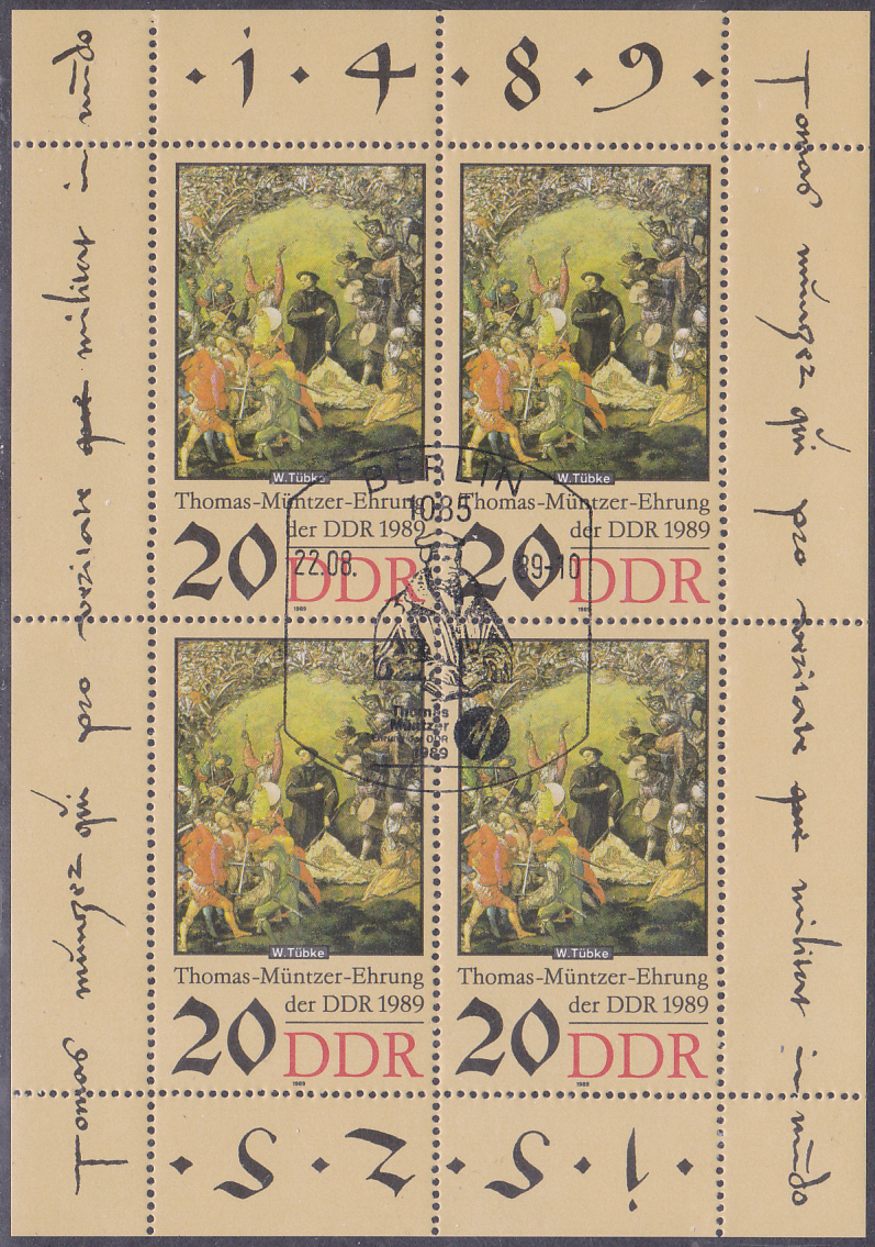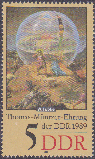 Zum 500. Geburtstag von Thomas Müntzer erschien in der DDR diese Marke (MiNr 3269) mit dem Detail "Verkündigung an den Bauern" aus dem Bauernkriegspanorama (Titel des Bildes "Frühbürgerliche Revolution in Deutschland"), das im Panorama Museum, einem eigens dafür errichteten Gebäudekomplex, auf dem Schlachtberg bei der thüringischen Kleinstadt Bad Frankenhausen zu besichtigen ist.