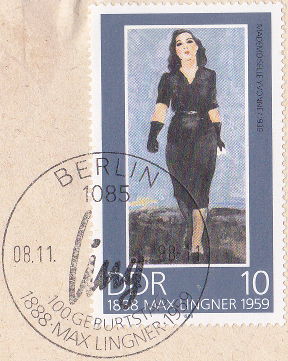Briefausschnitt mit der Marke DDR MiNr 3210 mit dem Gemälde "Mademoiselle Yvonne" von Max Lingner und dem Ersttagsonderstempel zu dieser Ausgabe.