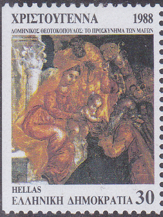 Eine Weihnachtsmarke 1988 aus Griechenland (MiNr 1713 A) zeigt "Die Anbetung der Könige" nach einem Gemälde von El Greco.