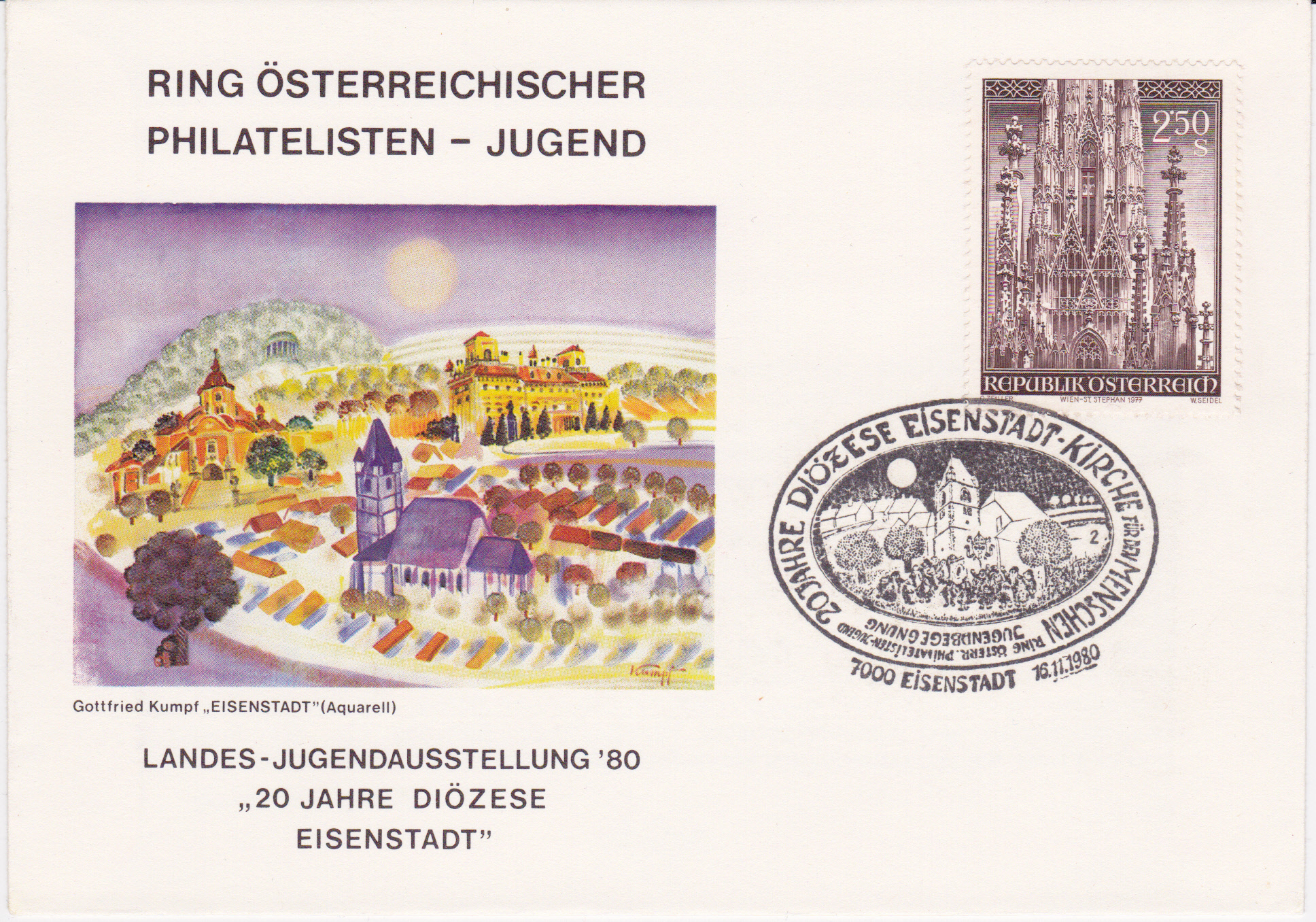Dieser Sonderstempel aus Eisenstadt vom 16.11.1980 mit der Kennziffer "2" zu einer Jugendbegegnung aus Anlass einer Briefmarkenausstellung der Jugend zum Jubiläum "20 Jahre Diözese Eisenstadt" wurde von Gottfried Kumpf entworfen. Typisch ist dabei die "Sonne", die auf vielen Gemälden mit Landschaften auftaucht. Der Umschlag zeigt sein Aquarell "Eisenstadt", das eine ähnliche Zeichnung zeigt, wie der Stempel.