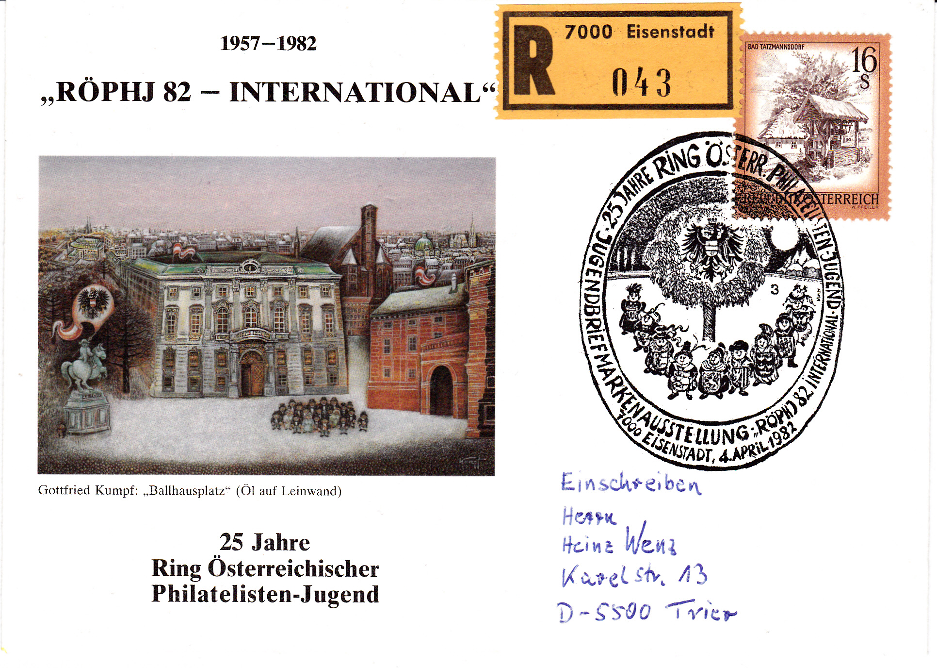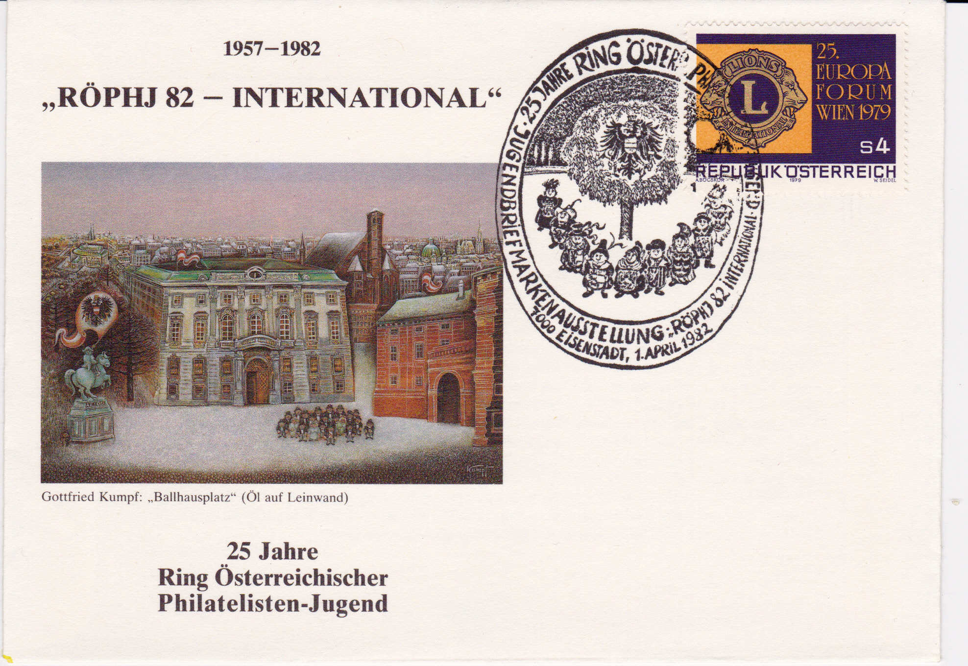 Dieser Sonderstempel vom 8.10.1983 mit der Kennziffer "4" aus A-7000 Eisenstadt zu einer Briefmarkenausstellung des Ring Österreichischer Philatelisten Jugend aus Anlass der Kumpf-Marke wurde ebenfalls von Gottfried Kumpf entworfen.