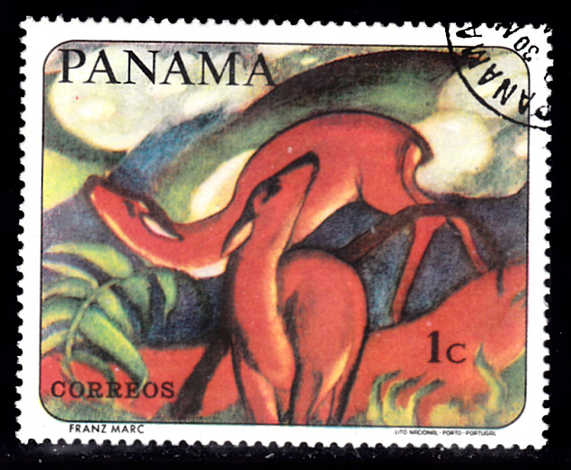 In einer Serie "Tiergemälde berühmter Maler" ist in Panama diese Marke (MiNr 1009) mit dem Gemälde "Die Roten Rehe) von Franz Marc erschienen.