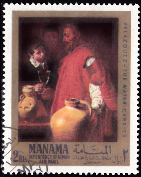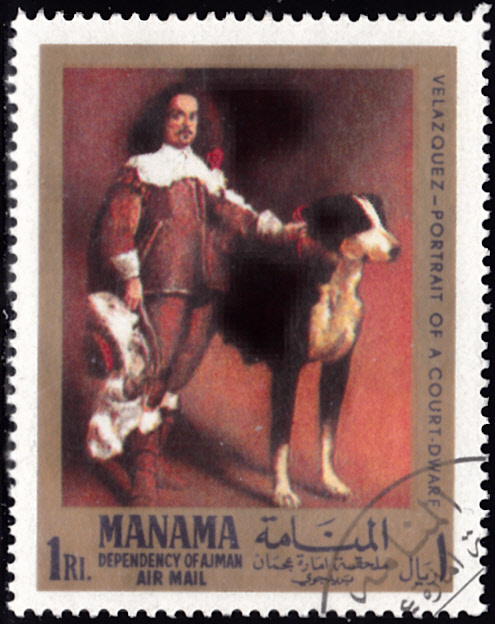 Diese Marke aus Ajman-Manama (MiNr 66 A) zeigt ein das Gemälde "Hofzwerg mit Hund" von Diego Velázquez. Es befindet sich im Museo del Prado in Madrid.
