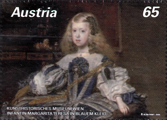 Auf dieser Marke aus Österreich (MiNr 2838) sehen wir das Gemälde "Infantin Margarita Teresa in blauem Kleid" von Diego Velázquez. Es befindet sich im Kulturhistorischen Museum in Wien.