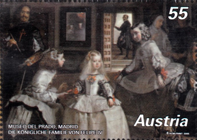 Diese Marke aus Österreich (MiNr 2837) zeigt das Gemälde "Die königliche Familie von Felipe IV." von Diego Velázquez. Es befindet sich im Museo del Prado in Madrid.