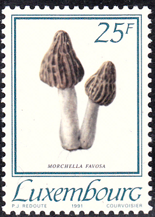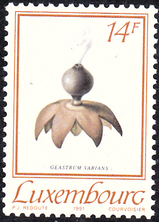 In Luxemburg erschienen 1991 vier Marken mit Aquarellen mit Pilzen von Pierre-Joseph Redouté. Hier eine Marke zu 14 Franc (MiNr 1267) mit einem Gewimperten Erdstern (Geastrum varians).