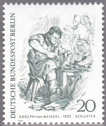 In der Serie "Berliner des 19. Jahrhunderts" ist in Berline eine Marke (MiNr 334) erscheinen mit der Abbildung "Schuster" nach einer Zeichnung von Adolph von Menzel.