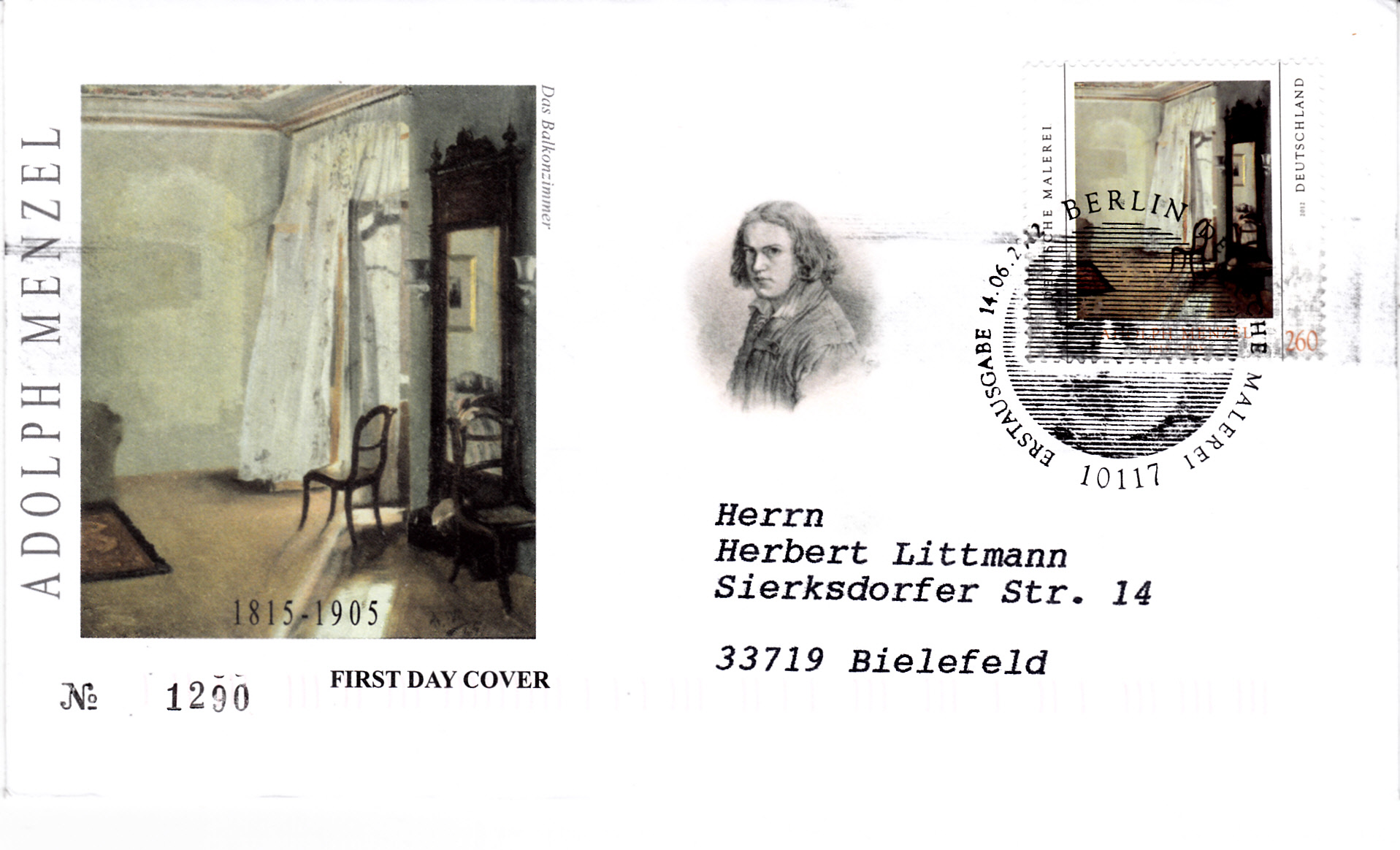 Der Ersttagsonderstempel Berlin zu dieser Marke zeigt im Stempelbild ein Porträt von Adolf von Menzel, das leider im Stempel auf diesem Brief schlecht zu erkennen ist.