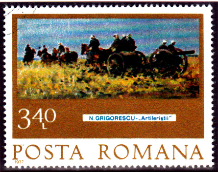 Die Marke aus Rumänien MiNr 3429 zeigt das Bild "Artilleristen".