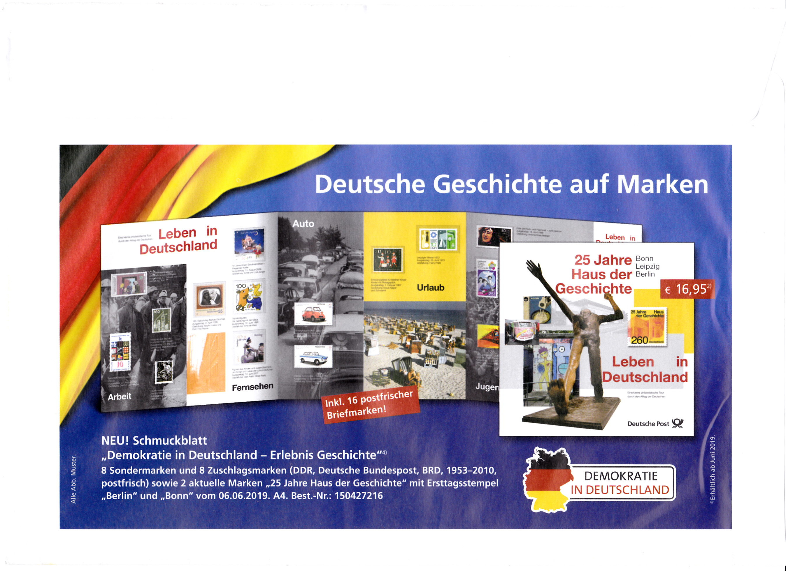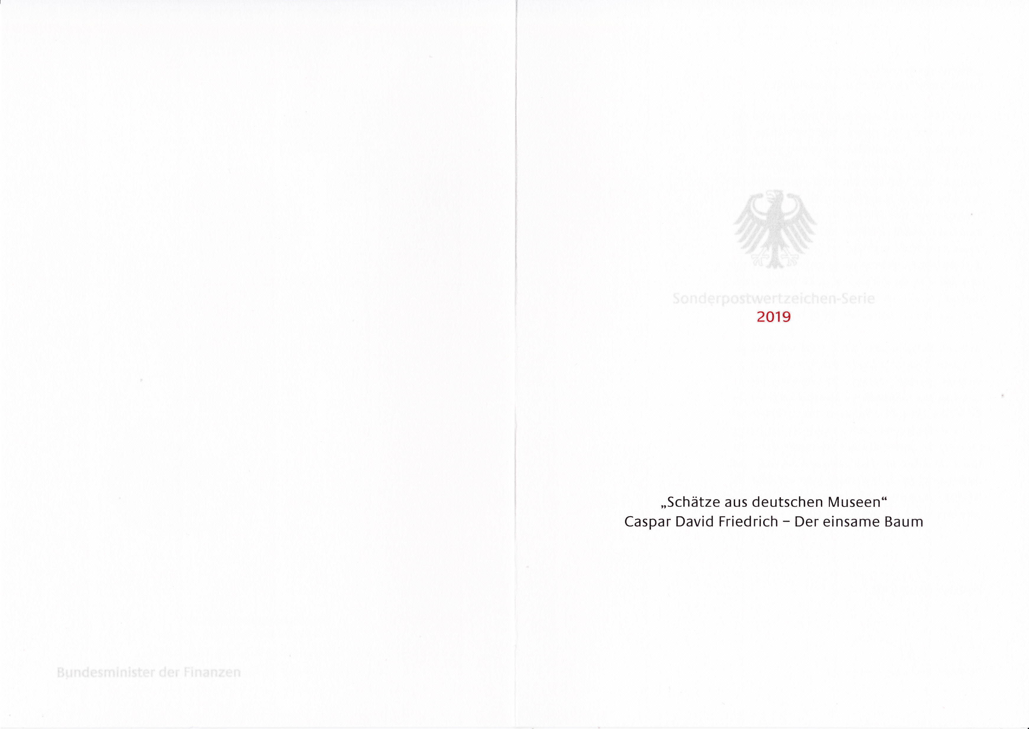 Diese Broschüre im Format 235 x 152 mm (unten geheftet) hat einen Wertstempel mit der 145 Cent Marke "Der einsame Baum" nach dem Gemälde von Caspar David Friedrich (MiNr 3433) aus der Serie "Schätze aus deutschen Museen". Die Vorausentwertung hat das Datum "21.-2.19".