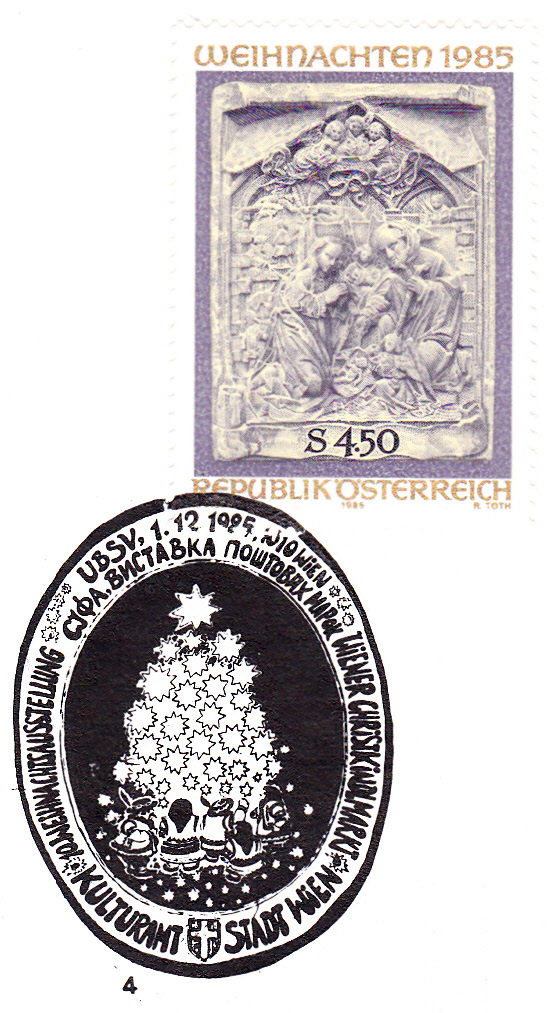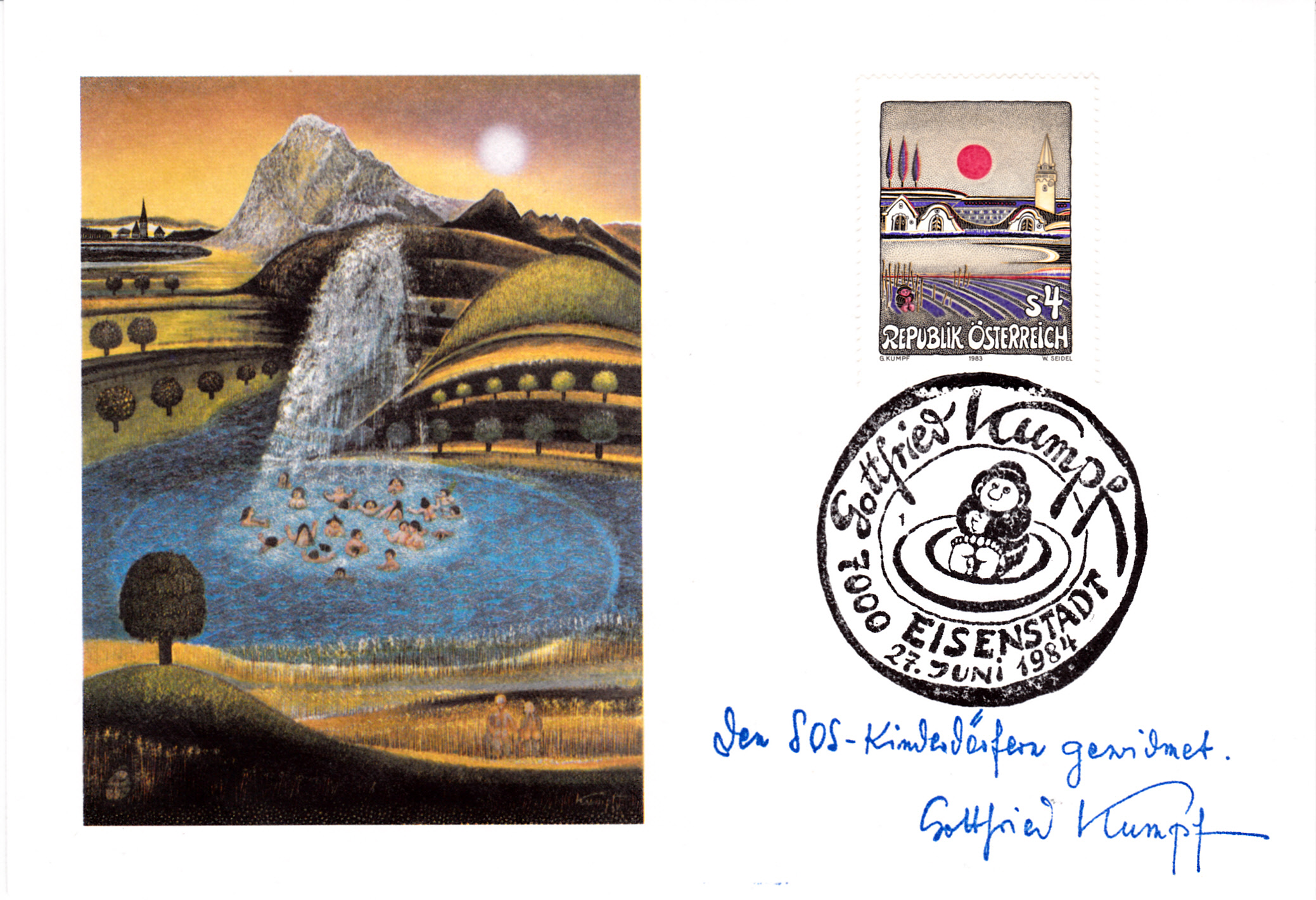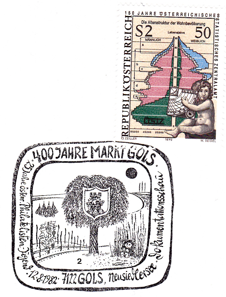 Ein weiterer von Gottfried Kumpf wurde am 12.8.1982 in A- 7122 Gols eingesetzt. Gols ist eine Markt- und Weinbaugemeinde im Norden des Burgenlandes, im Bezirk Neusiedl am See, östlich des Neusiedler Sees. Im Stempelbild ist das Wappen von Gols im Baum zu sehen, außerdem Weinreben und die typisch burgenländische Landschaft. Im Stempel ist auch ein Markenzeichen seiner Bilder zu finden, der Asoziale, der sich meist in irgendeiner Bildecke versteckt hält. Auch der Sonderumschlag zeigt ein Werk von G. Kumpf. Der hier gezeigte Stempel hat die Kennziffer "2".