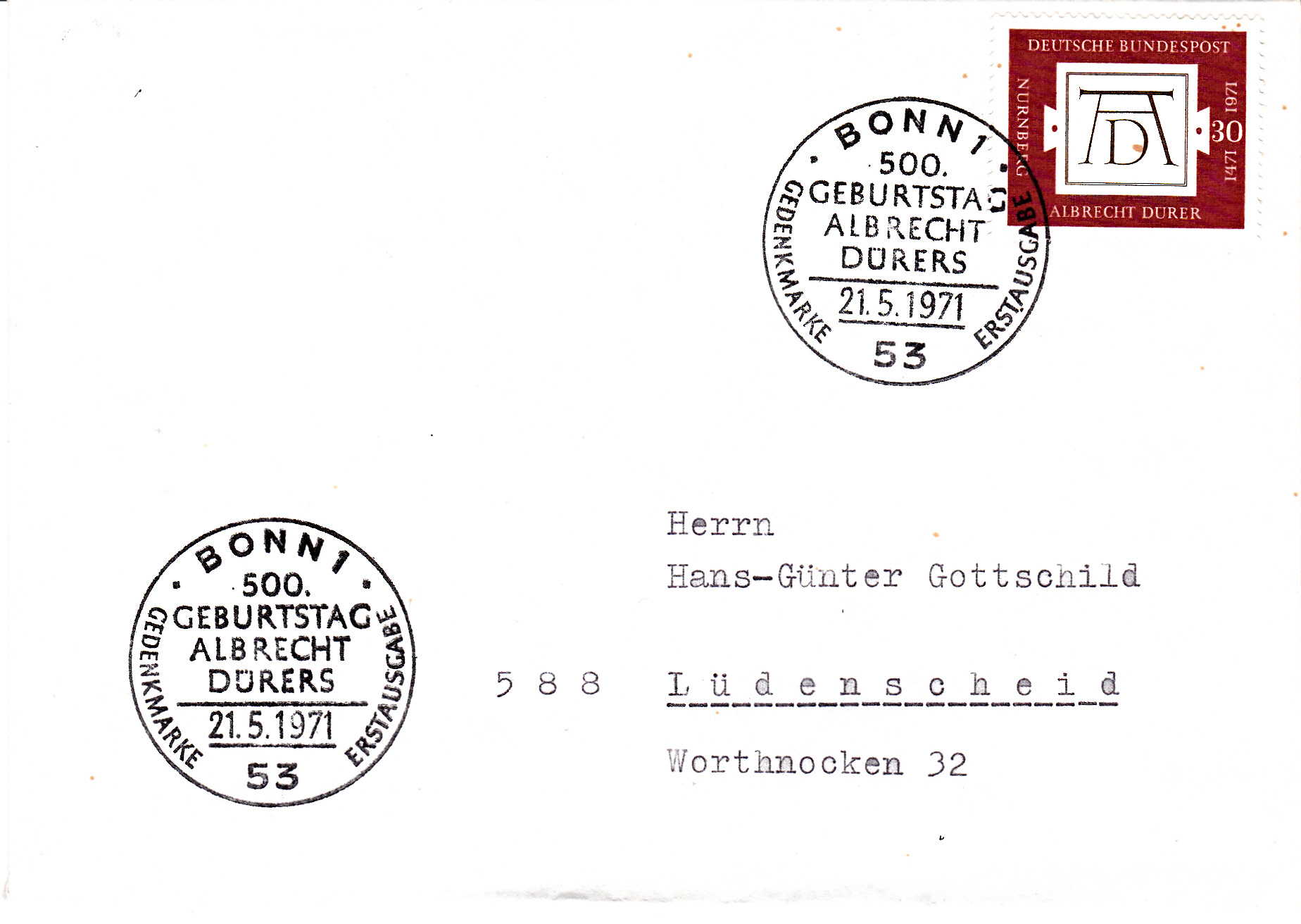 Zum 500. Geburtstag von Albrecht Dürer erschien bei der Deutschen Bundespost eine Marke (MiNr 677) mit Signum "AD"von A. Dürer. Hier eine Marke auf einem gelaufenen Ersttagsbrief mit dem Ersttagsonderstempel Bonn.