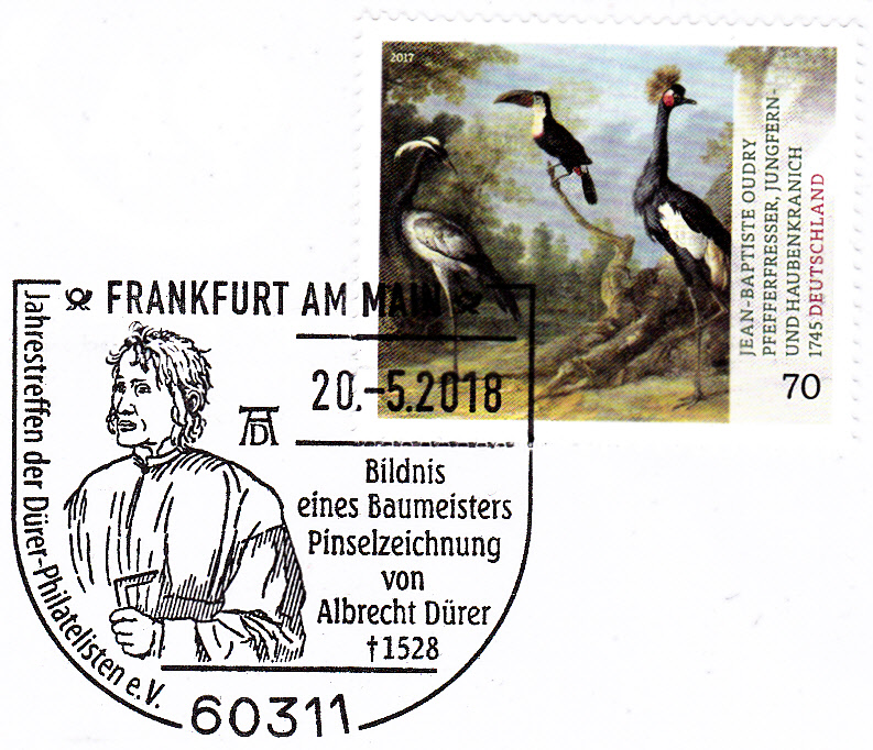 Dieser Sonderstempel aus Anlass des "Dürerjahres" (500. Geburtstag von Albrecht Dürer) zeigt im Stempelbild das Motiv "Jesusknabe mit Weltkugel" nach einem Gemälde von Albrecht Dürer. Auch die verwendete Marke passt zum Motiv Dürer. Sie zeigt das bereits vorgestellt Gemälde "Porträt einer Venezianerin" von Dürer aus dem Jahre 1505.