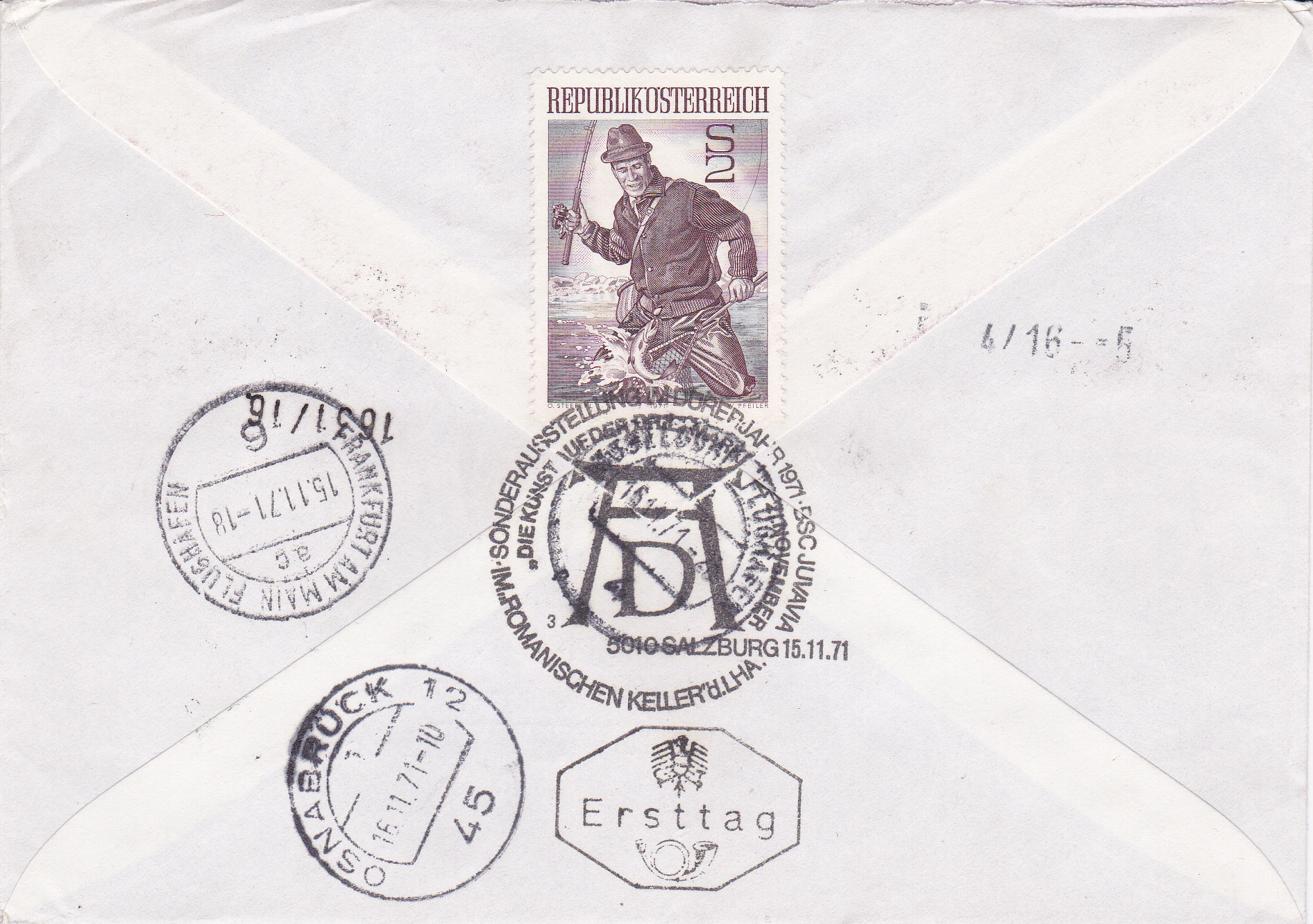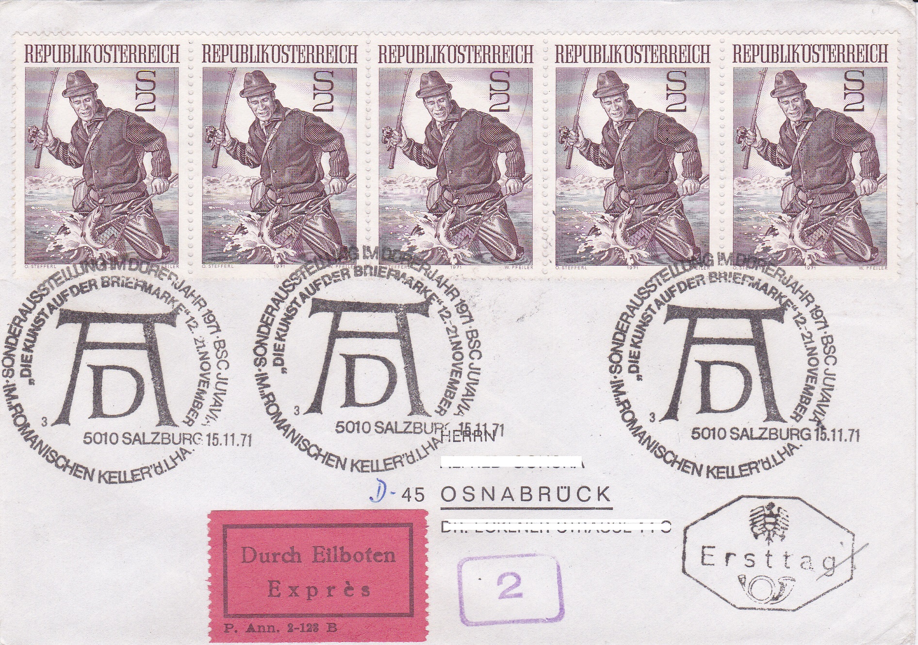 Brief mit Eilboten von Salzburg nach Osnabrück mit Sonderstempel aus Salzburg vom 15.11.1971 zu einer Ausstellung "Kunst auf der Briefmarke" im Dürerjahr 1971. Im Stempelbild wird Dürers Monogramm abgebildet. Rückseitig befinden sich noch eine Marke sowie Durchgangsstempel und Ankunftsstempel.