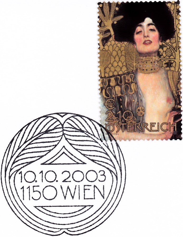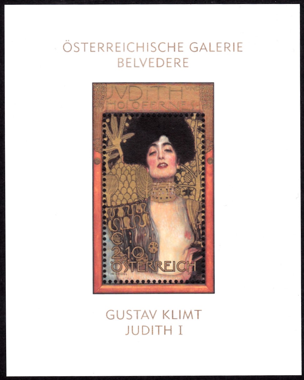 Aus Österreich kommt dieser Block (MiNr Block 22) mit einer Marke (MiNr 2449) zum Thema "Gemälde aus österreichischen Sammlungen" Die Marken zeigt das Gemälde "Judith I" von Gustav Klimt.