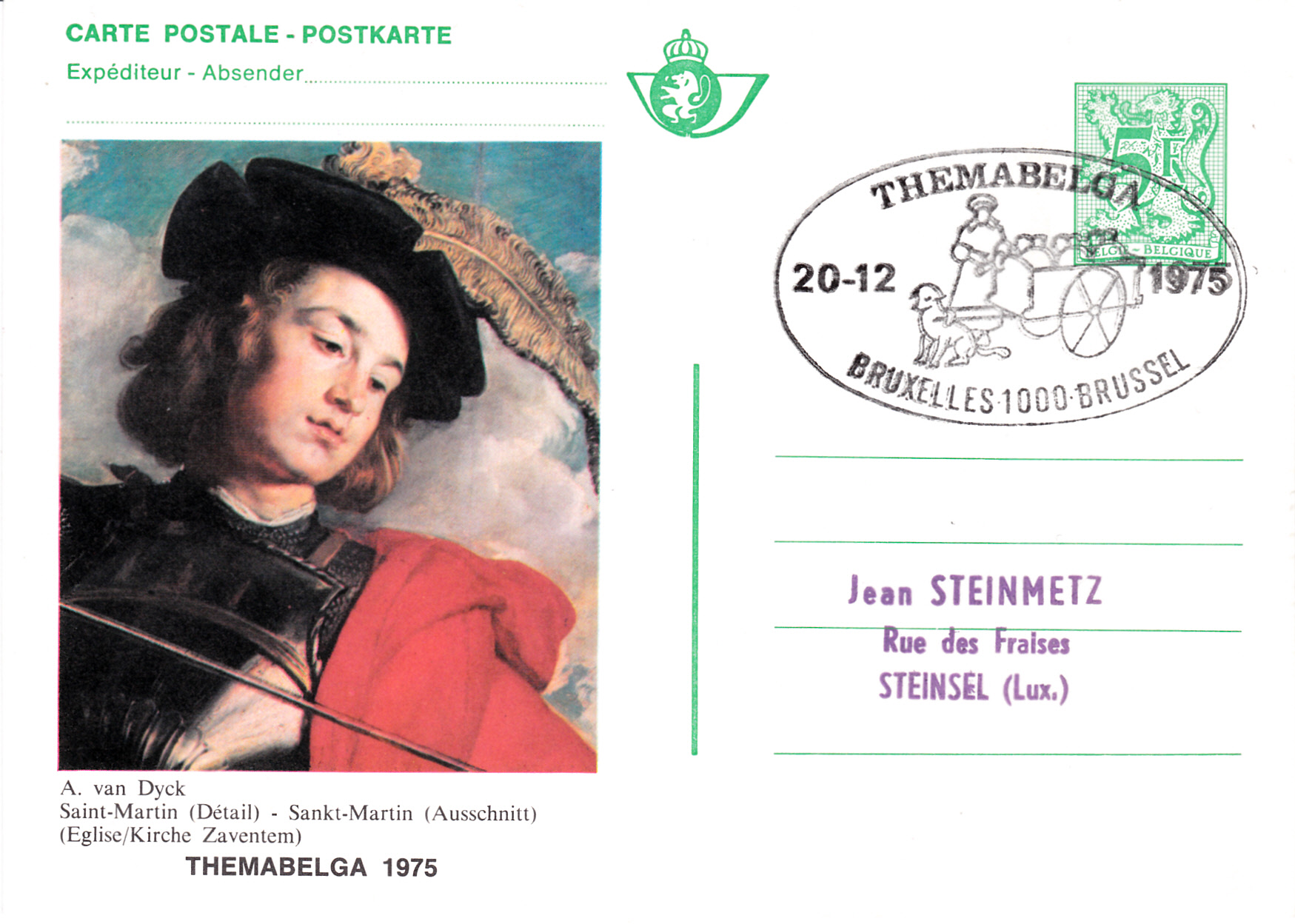 Ganzsache zur Themabelga 1975 mit einem Ausschnitt aus dem Gemälde "St. Martin" von Anthonis van Dyck. Die Karte wurde mit einem zum Ausgabeanlass der Karten passenden Sonderstempel entwertet.