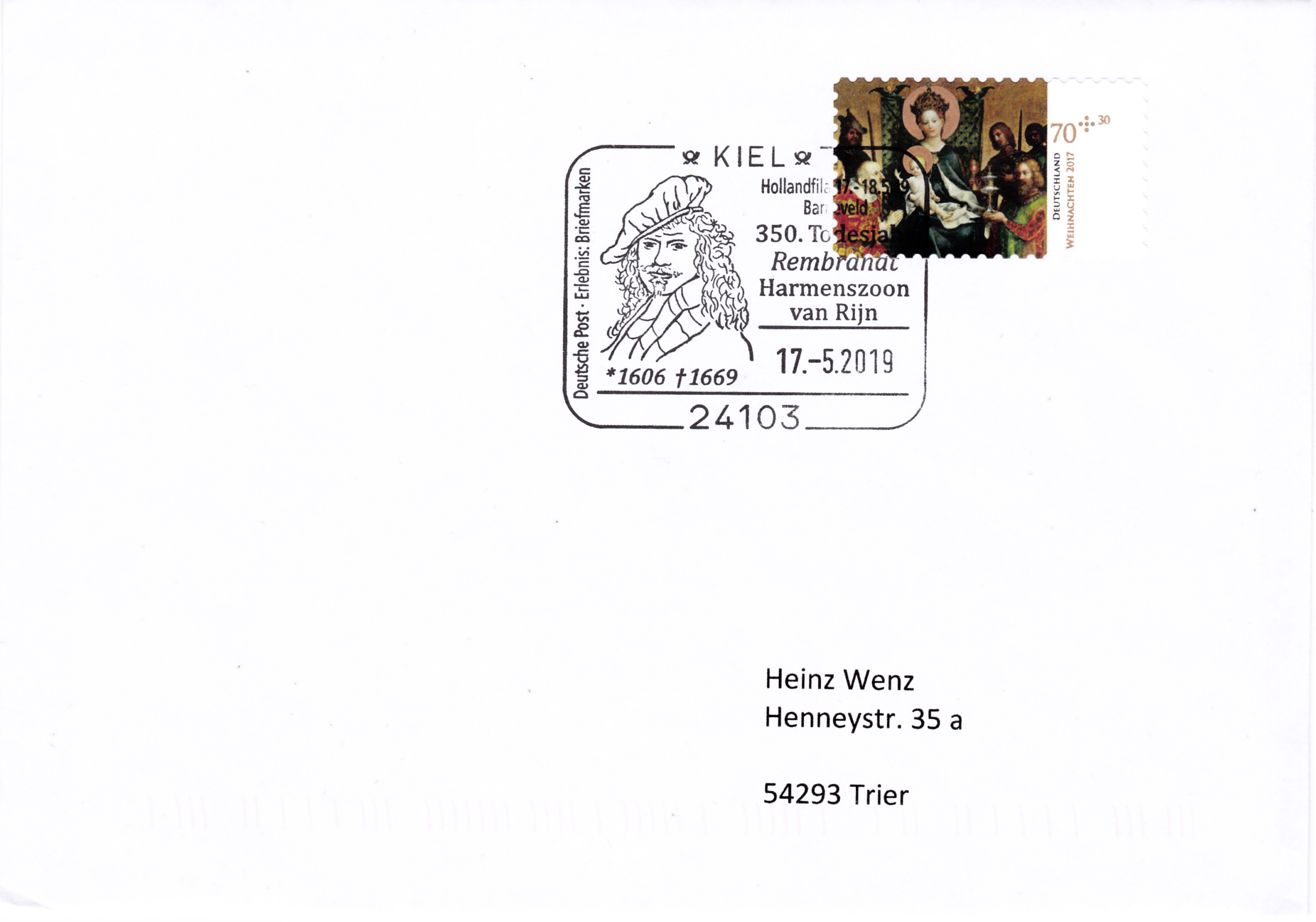 Sonderstempel vom 17.5.2019 zum 350 Todestag von Rembrandt Harmenszoon van Rijn. Im Stempelbild wird ein Selbstporträt von Rembrandt gezeigt.