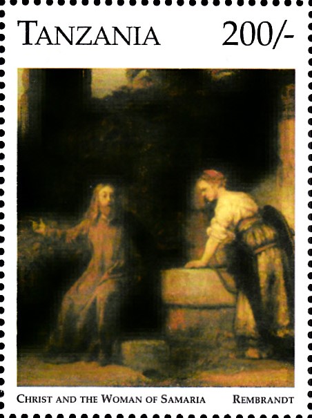 Aus einer Serie "125 Jahre Metropolitan Museum of Art, New York" aus Tansania stammt diese Marke (MiNr 2321) mit dem Gemälde "Christus und die Samariterin" von Rembrandt.