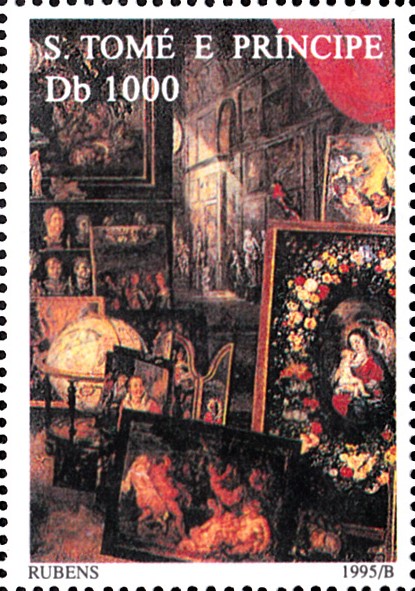 Diese Marke aus Sao Tomé und Principe (MiNr 1612) zeigt einen Ausschnitt aus der Gemeinschaftsarbeit "Die Allegorie des Geruchs" von Peter Paul Rubens und Jan Brueghel dem Älteren.