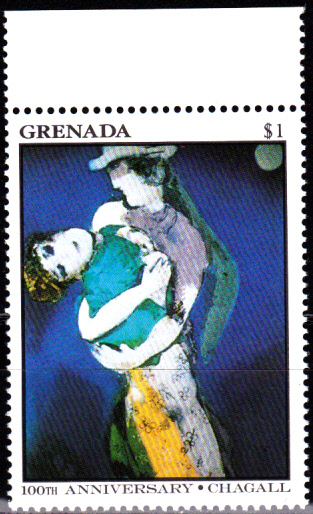 Auf dieser Marke aus Grenada (MiNr 1543) aus der Serie zum 100. Geburtstag von Marc Chagall ist das Werk "Liebende im Mondschein" abgebildet.
