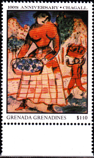 Auf dieser Marke aus Grenada-Grenadienen (MiNr 831) aus der Serie zum 100. Geburtstag von Marc Chagall wird sein Werk mit dem Namen "Die Obstverkäuferin" gezeigt.