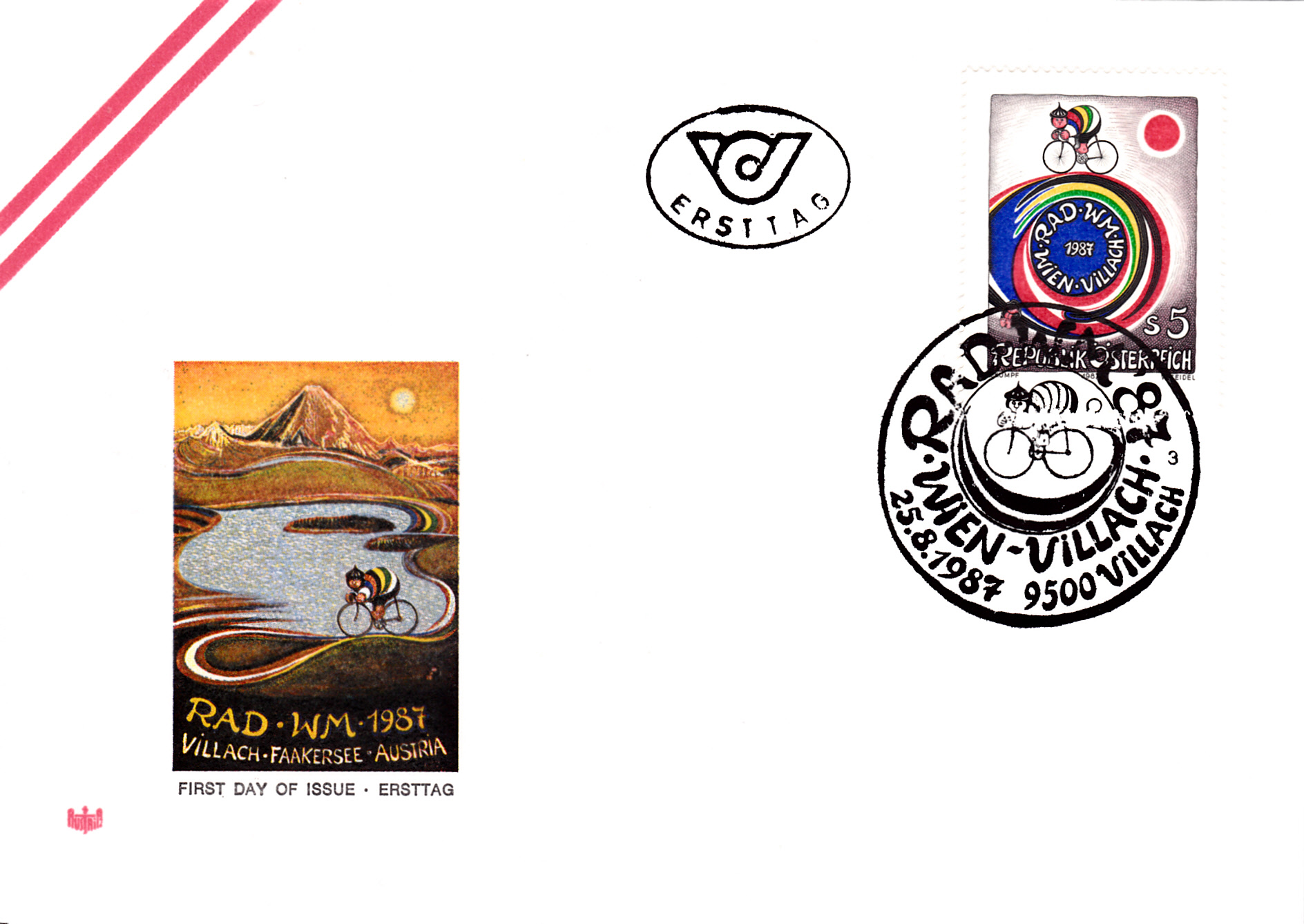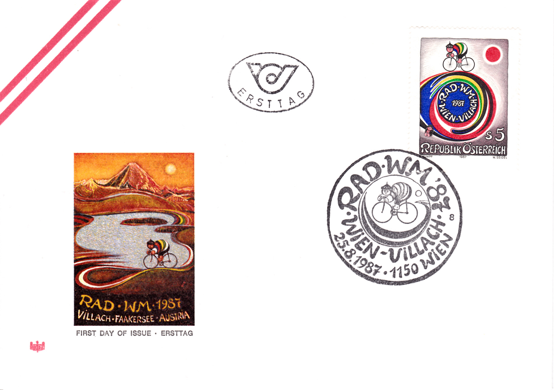 FDC mit der Marke zu den Straßen-Weltmeisterschaften 1987 in Villach aus Österreich (MiNr 1897) mit einem Plakat zur WM nach einem Entwurf von Gottfried Kumpf und dem Sonderstempel zum Ersttag aus Wien.