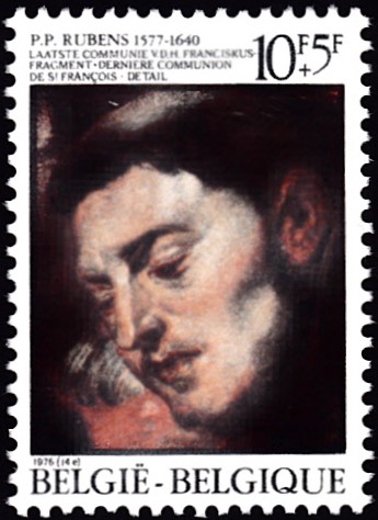Auf einer weiteren Marke zu 10 Fr + 5 Fr der gleichen Serie (MiNr 1872) ist ein Detail aus dem Gemälde "Letzte Kommunion des Hl. Franziskus" von Peter Paul Rubens abgebildet.