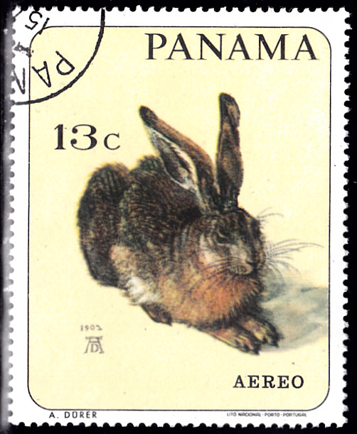 In einer Serie "Tiergemälde berühmter Maler" ist in Panama diese Marke (MiNr 1014) mit dem Aquarell "Feldhase" von Albrecht Dürer erschienen.