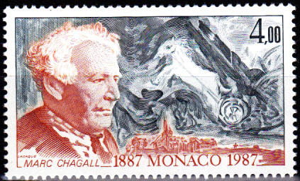 Zum 100. Geburtstag von Marc Chagall erschien in Monaco eine Briefmarke (MiNr 1835) mit seinem Kopfbild vor einem Gemälde.