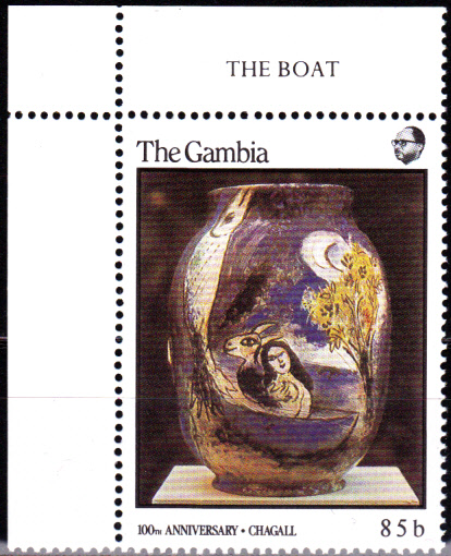 Die Marke aus Gambia MiNr 669 aus der gleichen Serie zum 100. Geburtstag von Marc Chagall zeigt "Das Boot". Hier zeige ich ein Eckrandstück vom linken oberen Bogenrand mit Eindruck des Titels in Englisch auf dem Bogenrand