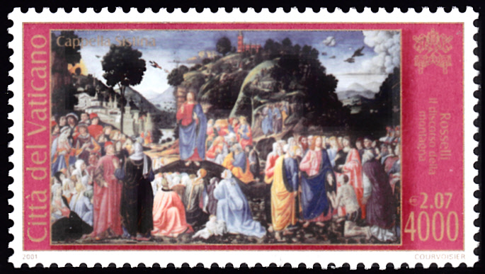 In der Serie "Fertigstellung der Restaurierungsarbeiten in der Sixtinischen Kapelle": Meisterwerke des Quattrocento" erschien im Vatikan diese Marke (MiNr 1365) mit dem Werk "Die Bergpredigt" von Cosimo Rosselli.