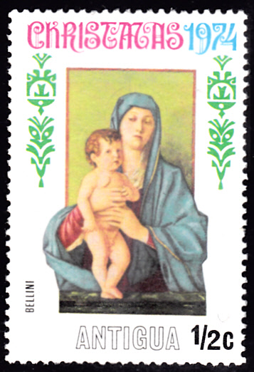 Auf dieser Weihnachtsmarke aus Antigua (MiNr 346) wird das Gemälde "Madonna degli alberetti" (1487) von Giovanni Bellini gezeigt, das sich in der Gallerie dell’Accademia in Venedig befindet.