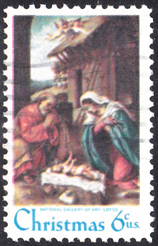 Eine Weihnachtsmarke 1970 der USA (MiNr 1016) zeigt das Gemälde "Die Geburt Christi" von Lorenzo Lotto (um 1480-1556, italienischer Maler).