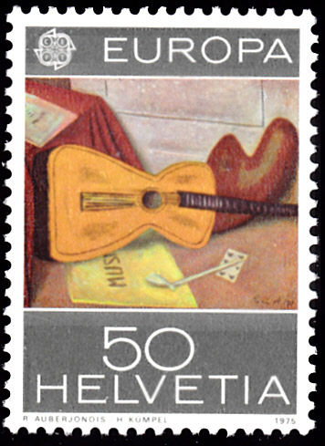 Die Europamarke 1975 zu 50 Rappen aus der Schweiz (MiNr 1051) zeigt das gemälde "Stilleben mit Gitarre" von René Auberjonois.