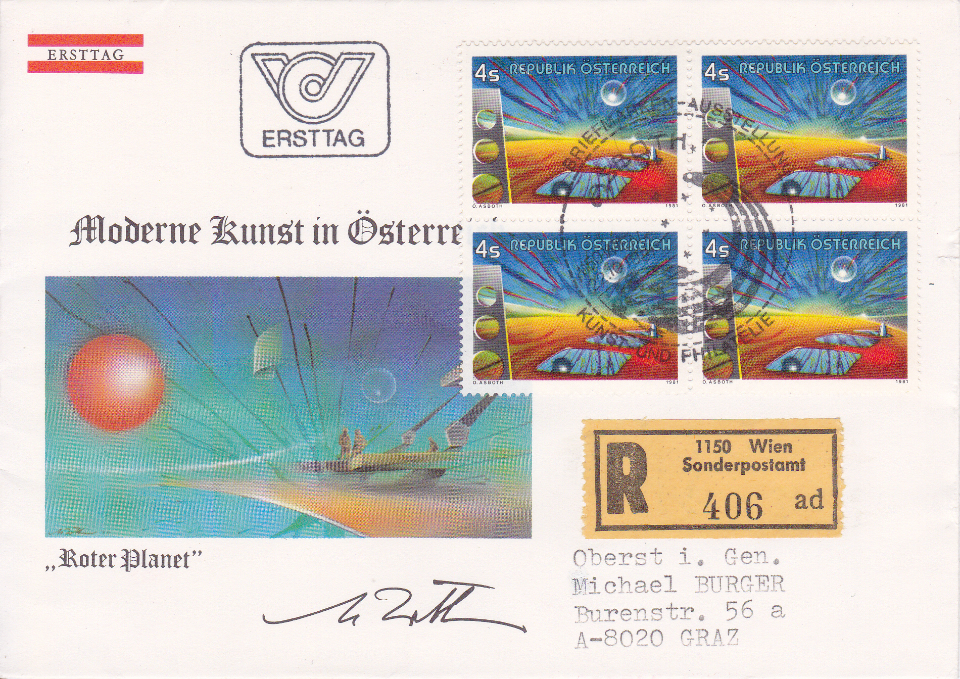 Brief per Einschreiben mit einer Mehrfachfrankatur vom Ersttag der Marke (MiNr 1687) mit dem Gemälde "Zwischen den Zeiten" von Oscar Asboth und einem themenbezogenen Sonderstempel aus Wien.