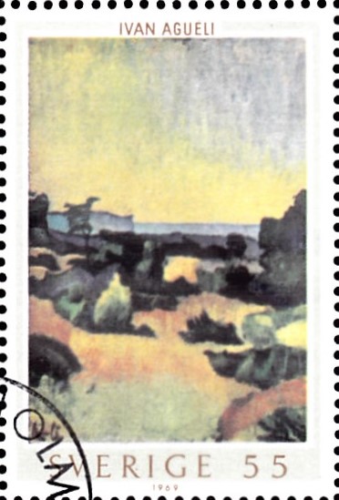 Auf dieser Marke (MiNr 643) aus dem gleichen Block sehen wir das Gemälde "Gotländskt landskap" ("Gotland-Landschaft") von Ivan Aguéli.
