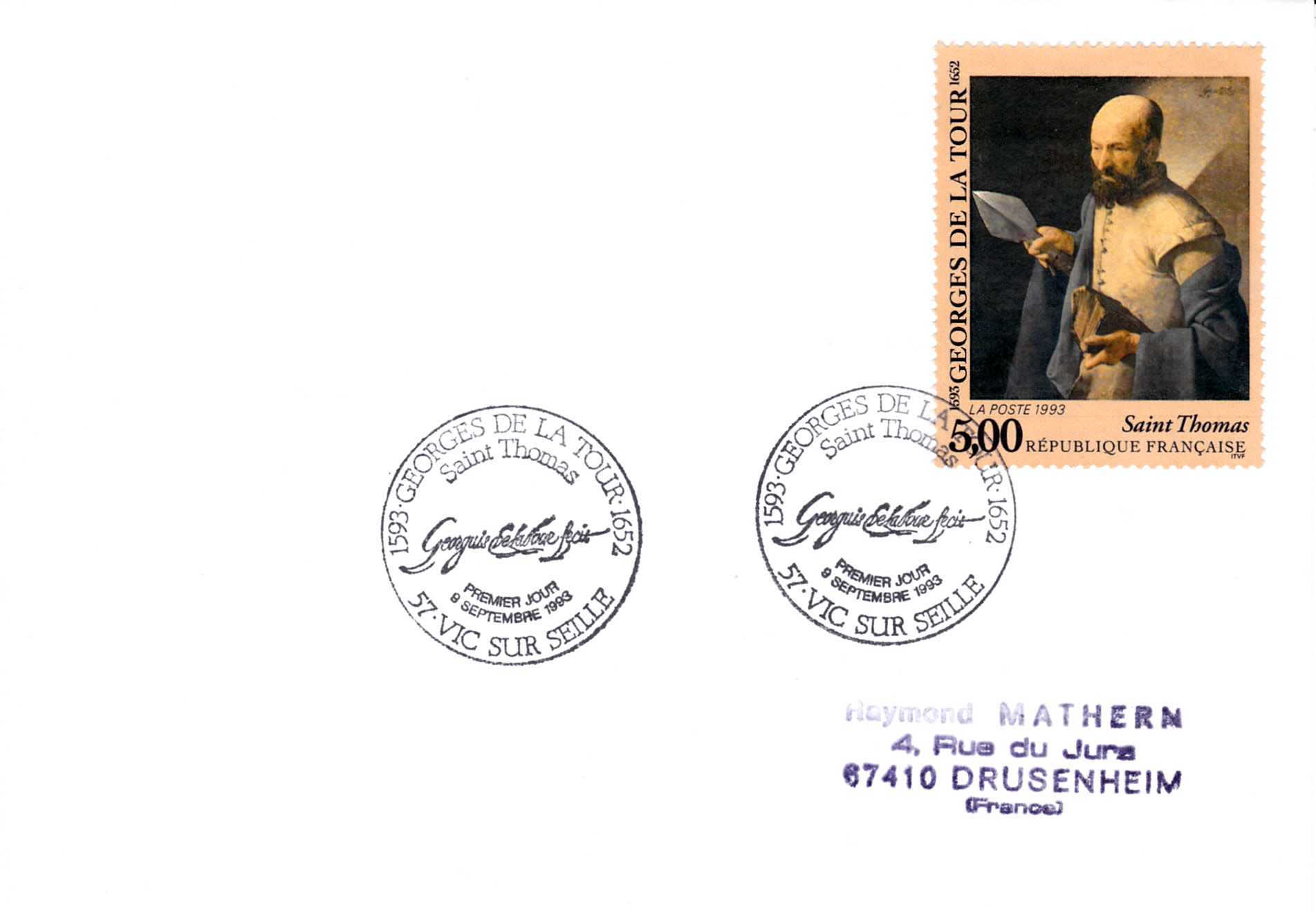 Im Ersttagsonderstempel seines Geburtsortes Vic-sur-Seille wird eine Unterschrift von Georges de La Tour gezeigt.