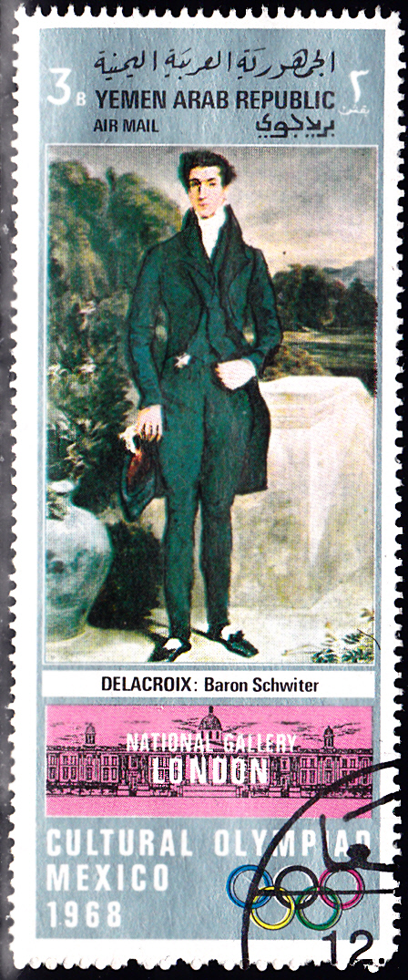 Eine Marke (MiNr 1015) aus Jemen-Nord (Königreich) bildet einen Ausschnitt aus dem Gemälde "Baron Schwiter" von Eugène Delacroix ab.