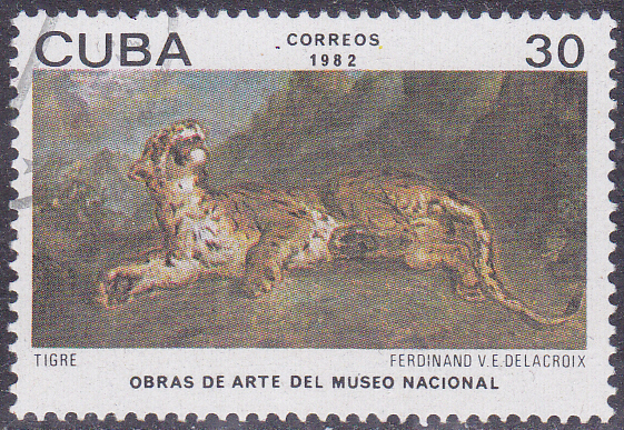 Diese Marke aus Kuba (MiNr 2663) zeigt das Gemälde "Der Tiger" von Ferdinand Victor Eugène Delacroix.