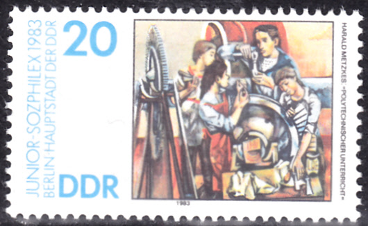 Zur Internationalen Briefmarkenausstellung junger Philatelisten der sozialistischen Länder JUNIOR-SOZPHILEX in Berlin ist eine Marke (MiNr 2813) mit dem Gemälde "Polytechnischer Unterricht von Harald Metzkes erschienen.