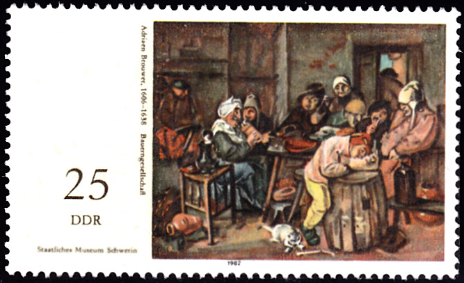 Diese Marke aus der DDR (MiNr 2729) bildet das Gemälde "Bauerngesellschaft" von Adrian Brouwer ab.