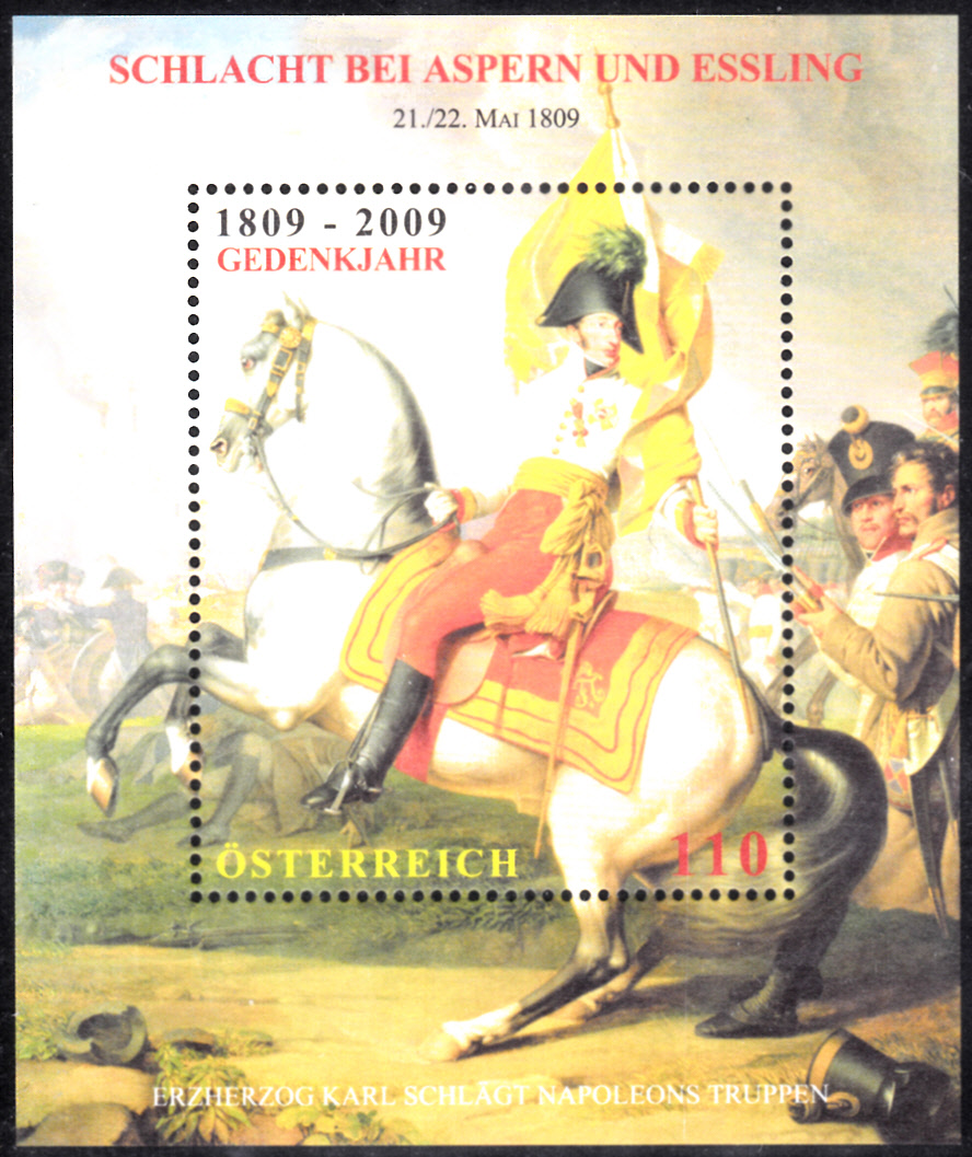 Aus Österreich kommt dieser Block (MiNr Block 52 mit Marke MiNr 2813) mit der Abbildung "Erzherzog Karl mit der Fahne des Regiments Zach in der Schlacht bei Aspern" nach einem Gemälde von Johann Peter Krafft.