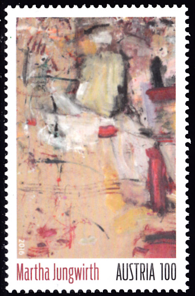 Diese österreichische Marke (MiNr 33255) zeigt ein Gemälde aus der Serie "Fundraising" von Martha Jungwirth.