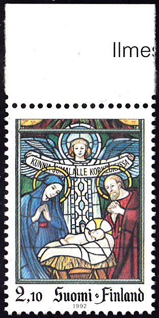 Eine Weihnachtsmarke 1992 aus Finnland (MiNr 1196) bildet die Glasmalerei "Christi Geburt" von Franz Xaver Zettler in der Kirche von Karkkila ab.