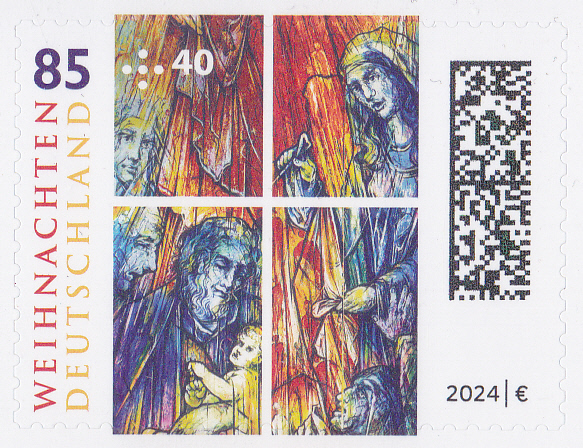 Auf der Weihnachtsmarke 2024 der Deutschen Post (MiNr 3862) wird "Himmlisches Licht", ein Detail eines Kirchenfensters der Abteikirche Tholey, von Mahbuba Elham Maqsoodi.