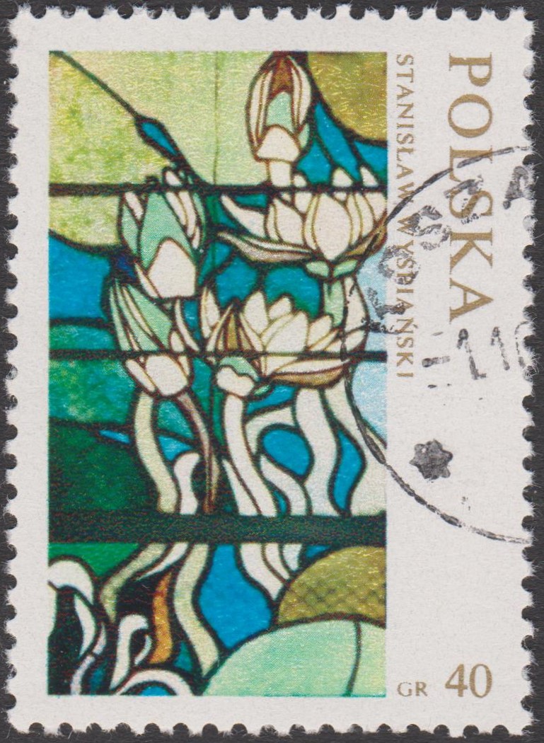 Polen MiNr. 2103 zeigt als Beispiel für Glasmalerei "Wasserlilien" von Stanisław Wyspiánski (1869-1907) aus dem Zyklus "Elemente" in der Franziskaner-Kirche in Krakau: