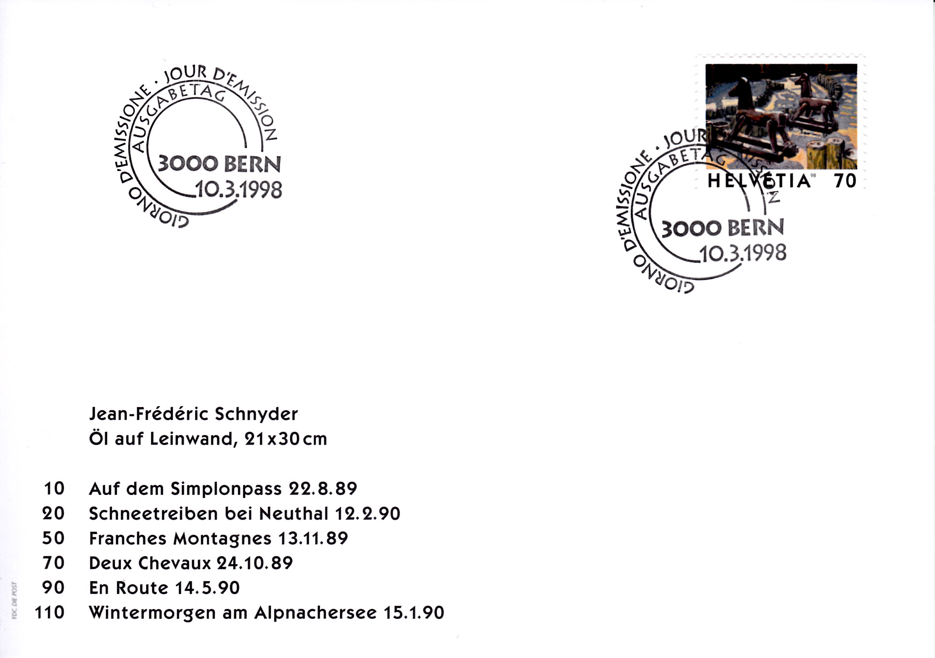 In der Dauerserie "Bilder der Schweiz" sind Gemälde von Jean-Frédéric Schnyder abgebildet. Die Marke zu 10 Rappen (MiNr 1643) zeigt das Bild "Auf dem Simplonpass".