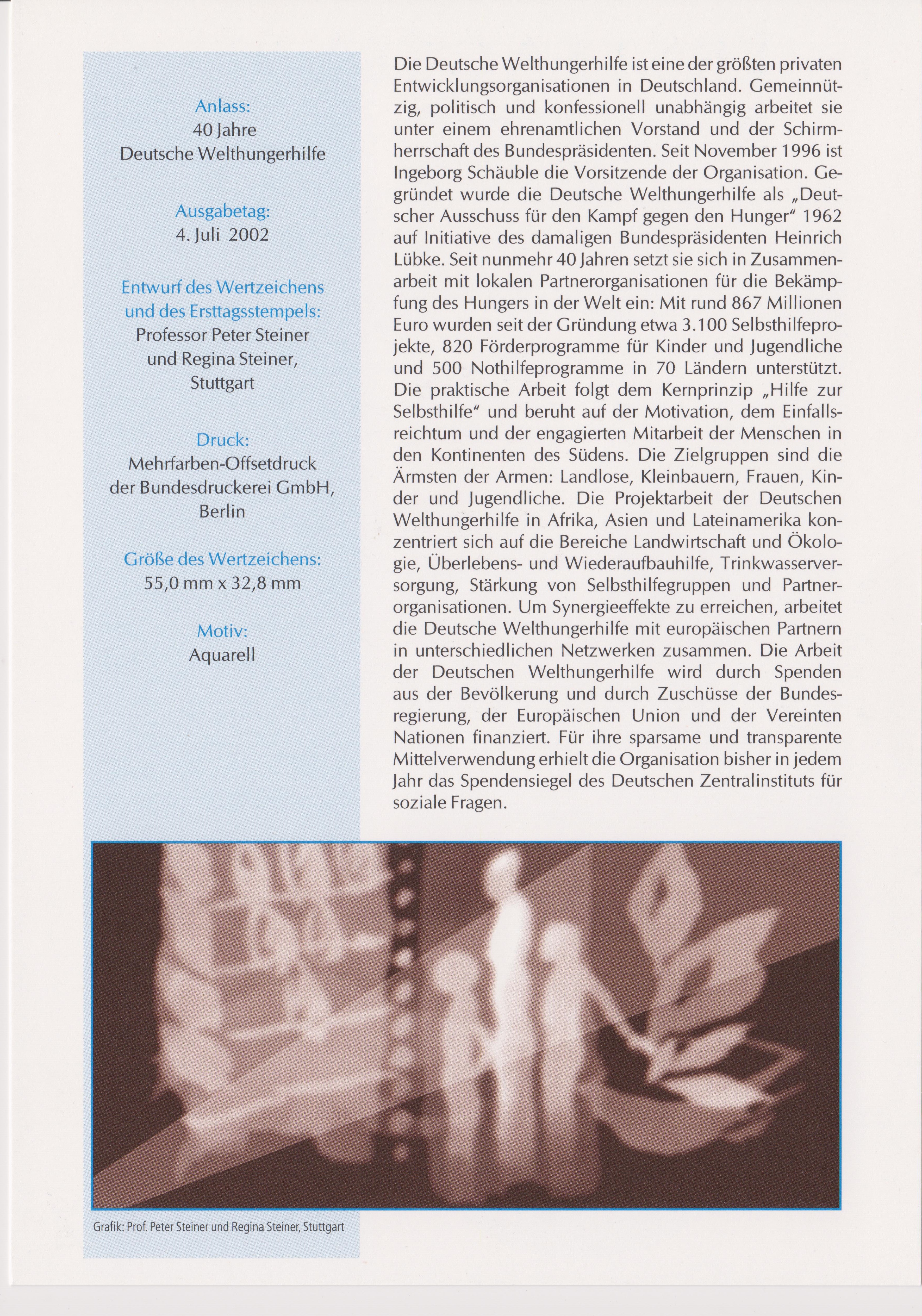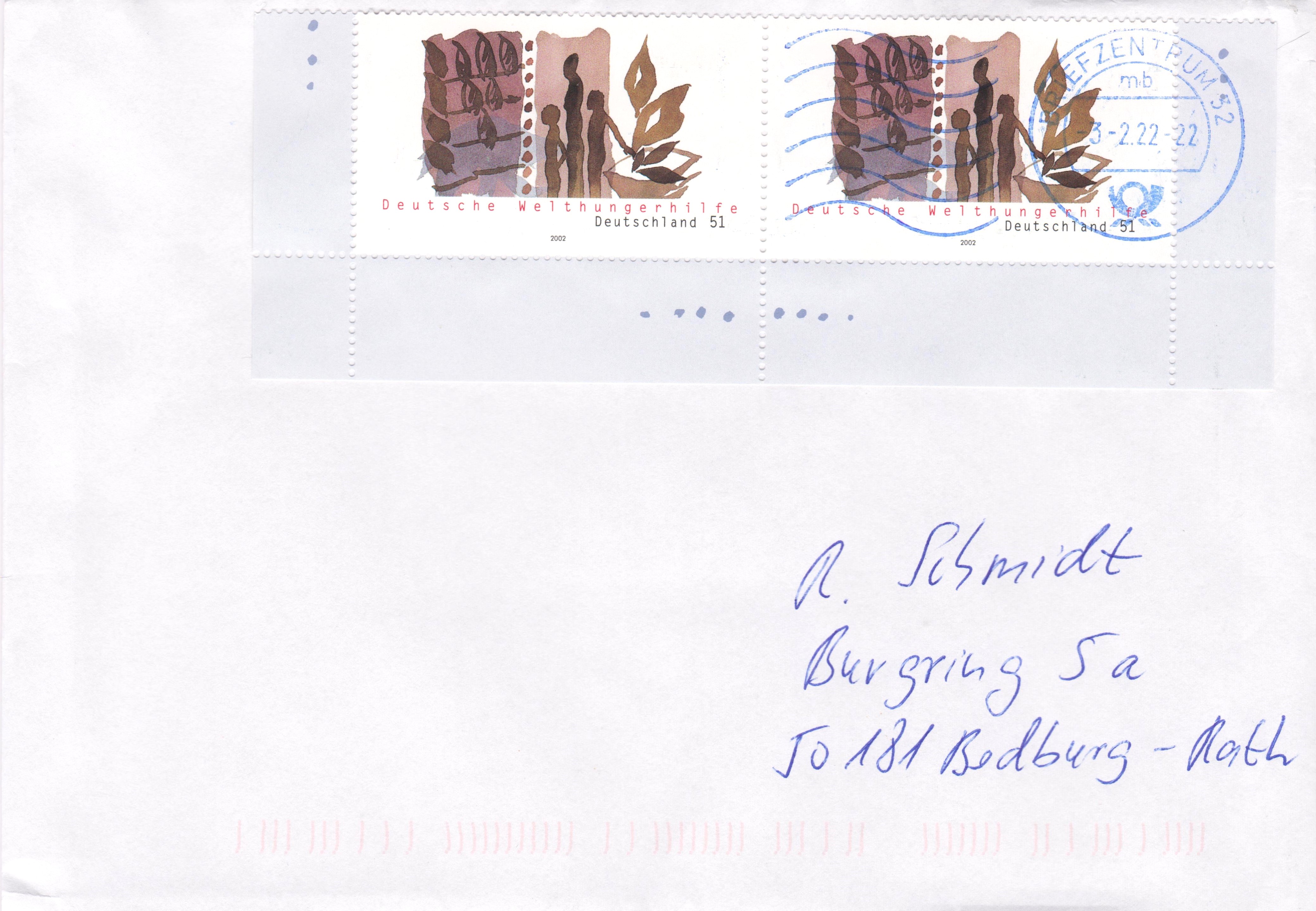 Bund MiNr. 2271 zeigt die Symbolik der Organisation "Deutsche Welthungerhilfe" in Form eines Aquarells, hier ein Paar vom Unterrand des Zehnerbogens auf Brief aus meinem aktuellen Posteingang: